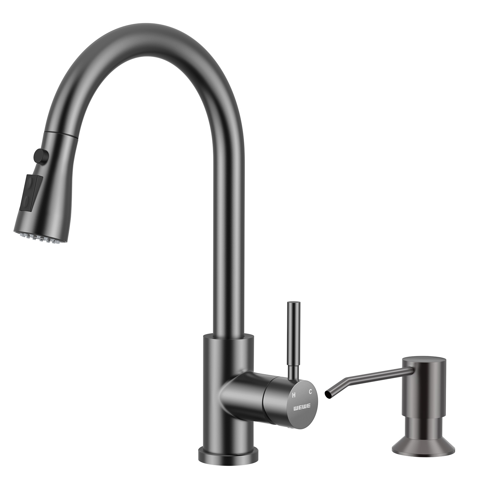 WEWE Kitchen Faucet with Pull Down Sprayer and Soap Dispenser, Stainless Steel Kitchen Sink Faucets, 3-Mode High Arc Single Handle Faucet for RV Farmhouse, Matte Gray