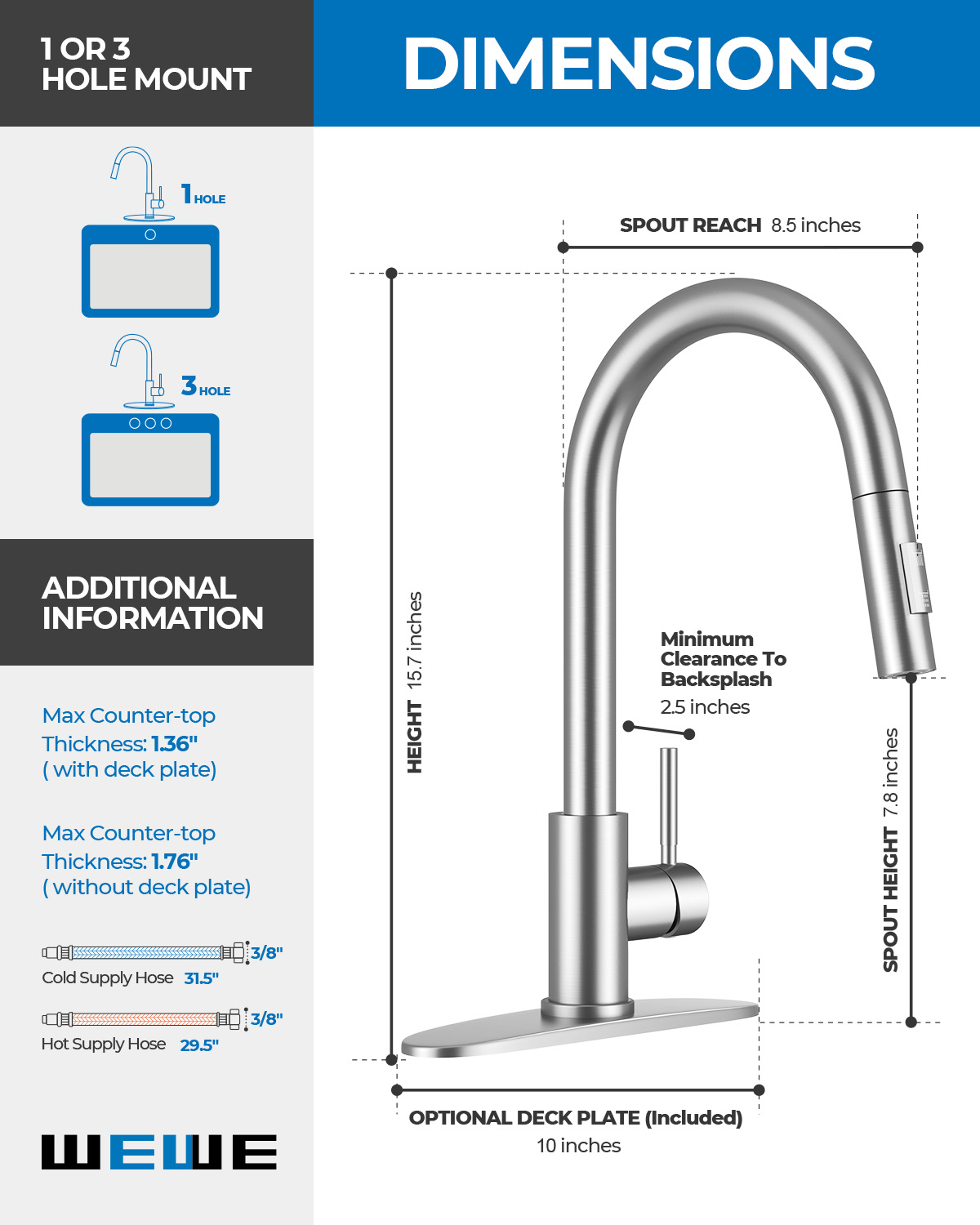 | Included Components | Kitchen faucet, Deck plate, Mounting accessory, Instruction manual, Warranty card |