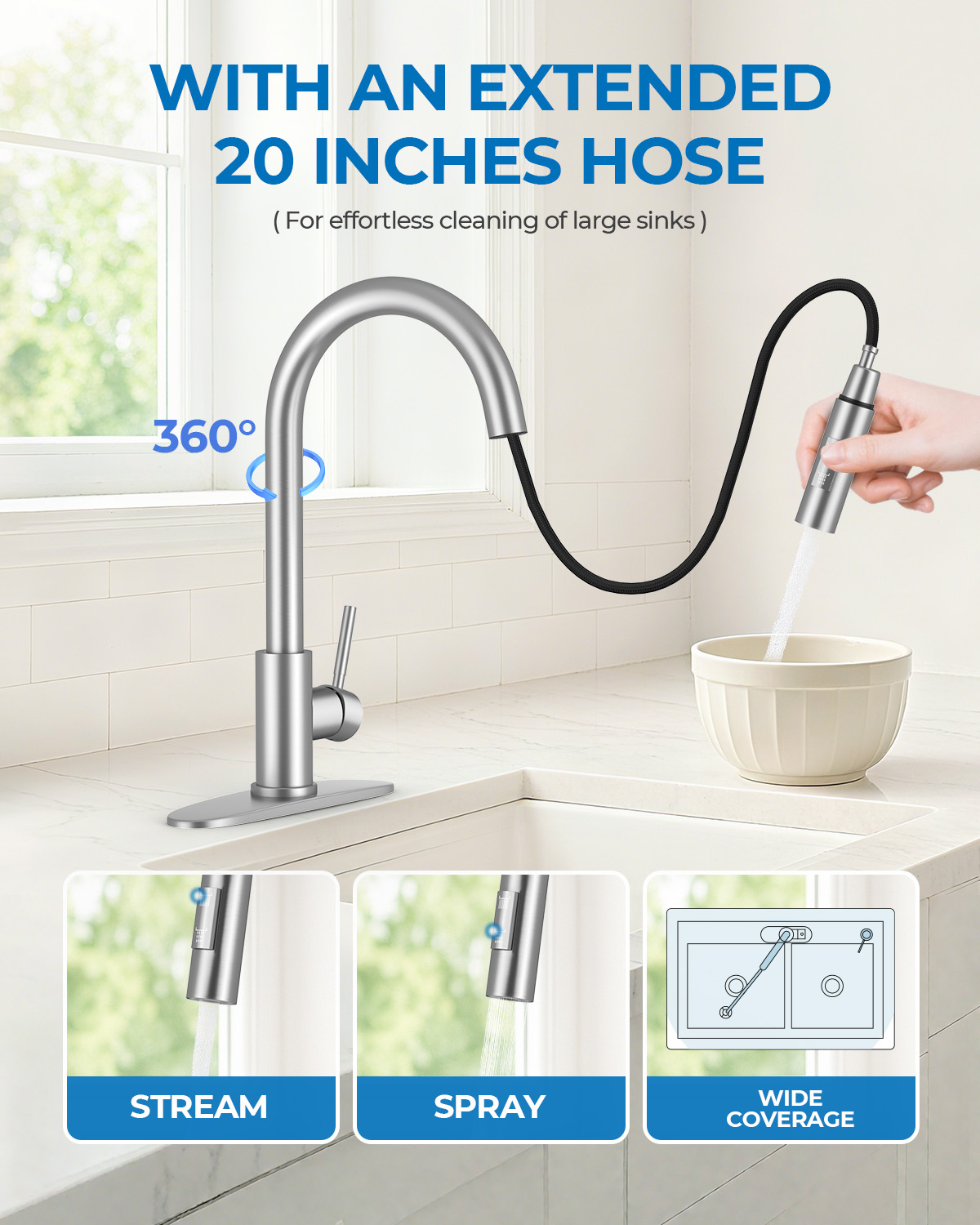 - [Maximized Workspace & Flexibility] Enjoy unrestricted movement. The high-arc profile offers superior clearance for washing oversized cookware, while the 20-inch retractable hose glides smoothly to clean the entire sink basin. These flexible kitchen sink faucets automatically dock securely after use, keeping your countertop clutter-free.