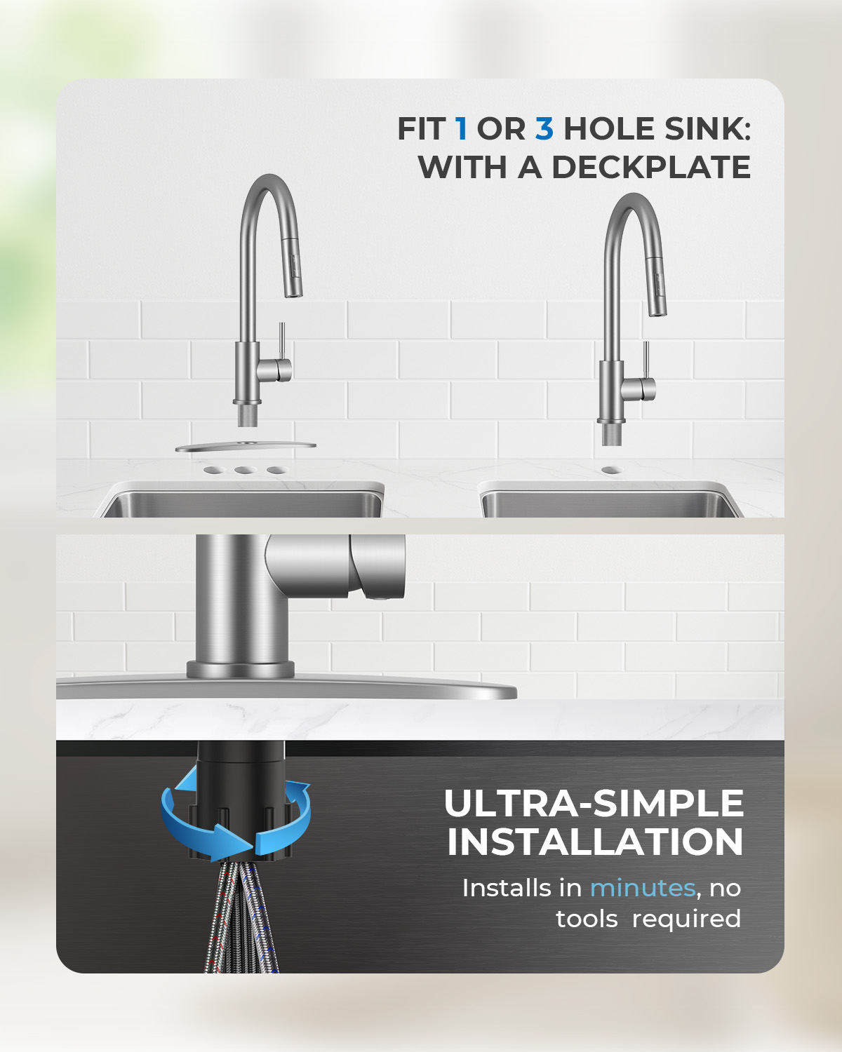- [Beginner-Friendly DIY Setup] No professional help required. We pre-assembled the water lines to make installing this kitchen sink faucet a breeze. Even if it’s your first time, you can secure the faucet in minutes using the included deck plate (for 1 or 3 holes), avoiding the frustration of complex plumbing work.