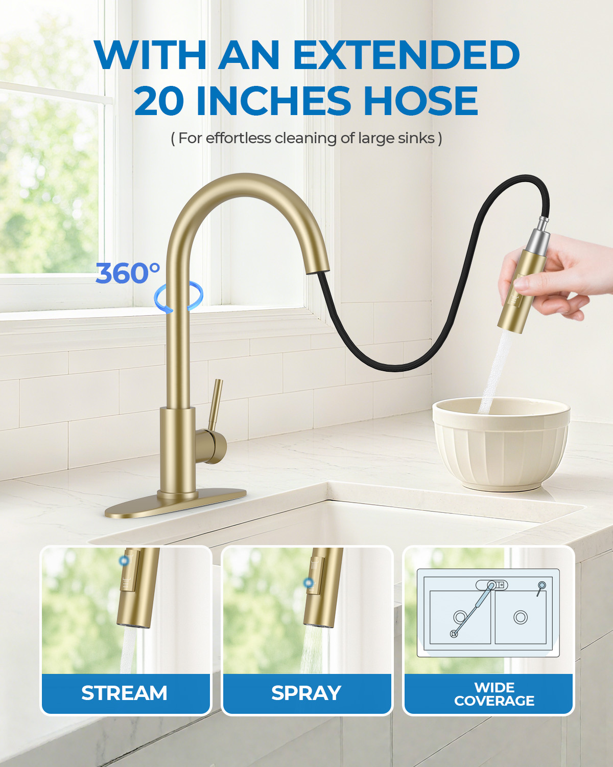- [Maximized Workspace & Flexibility] Enjoy unrestricted movement. The high-arc profile offers superior clearance for washing oversized cookware, while the 20-inch retractable hose glides smoothly to clean the entire sink basin. These flexible kitchen sink faucets automatically dock securely after use, keeping your countertop clutter-free.