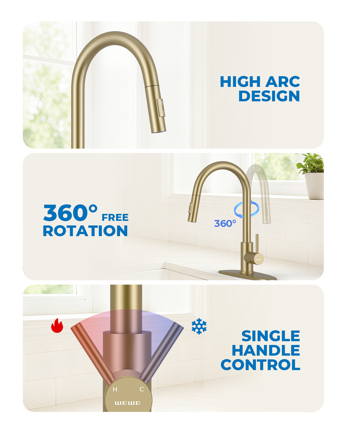 WEWE Kitchen Faucet with Pull Down Sprayer, Gold SUS304 Stainless Steel Kitchen Sink Faucets, High Arc Single Handle Faucet for Kitchen Sink, Commercial Modern Farmhouse RV Utility Faucet