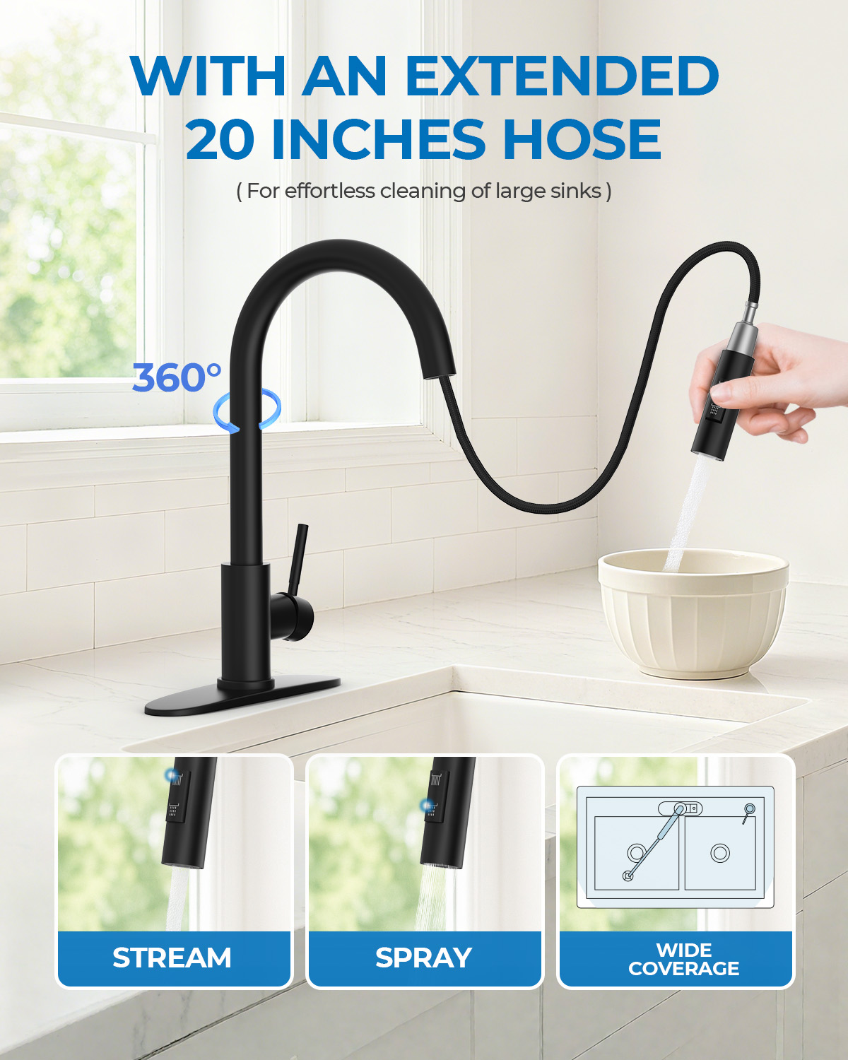 - [Streamlined 2-Function Performance] Experience focused efficiency without the gimmicks. Our kitchen faucet with pull down sprayer delivers optimized water pressure (1.8 GPM) through two essential modes: a splash-free Aerated Stream for filling and a robust Spray for scrubbing. The mechanical toggle switch is designed for reliable, snap-action reuse.