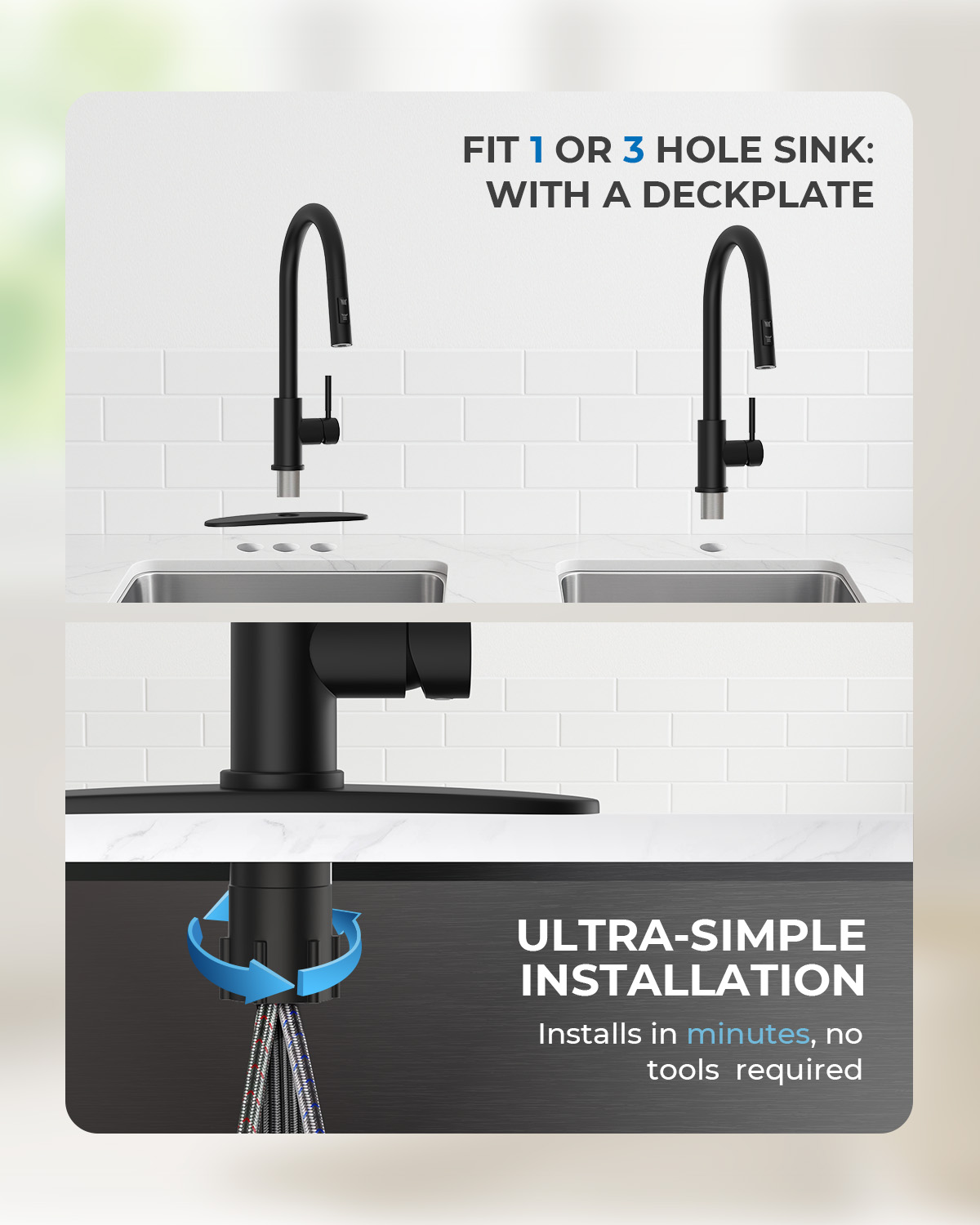 - [Beginner-Friendly DIY Setup] No professional help required. We pre-assembled the water lines to make installing this kitchen sink faucet a breeze. Even if it’s your first time, you can secure the faucet in minutes using the included deck plate (for 1 or 3 holes), avoiding the frustration of complex plumbing work.
