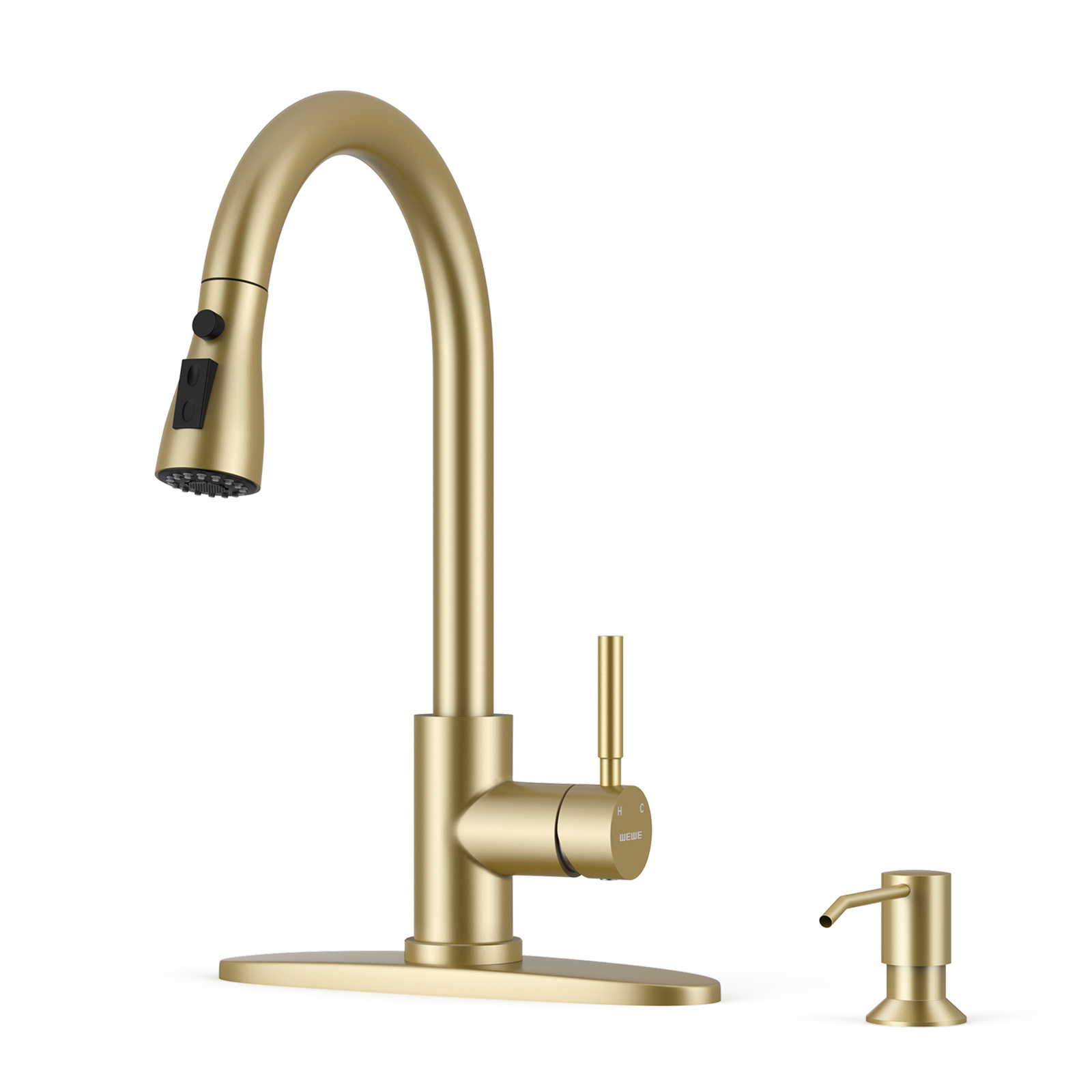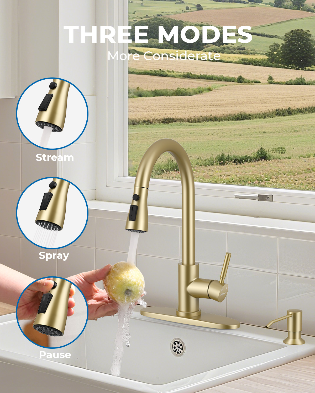 WEWE Kitchen Faucet with Soap Dispenser and Pull Down Sprayer, RV Single Handle Classic 3 Modes Stainless Steel Faucet for Kitchen Sink, RV, Gold