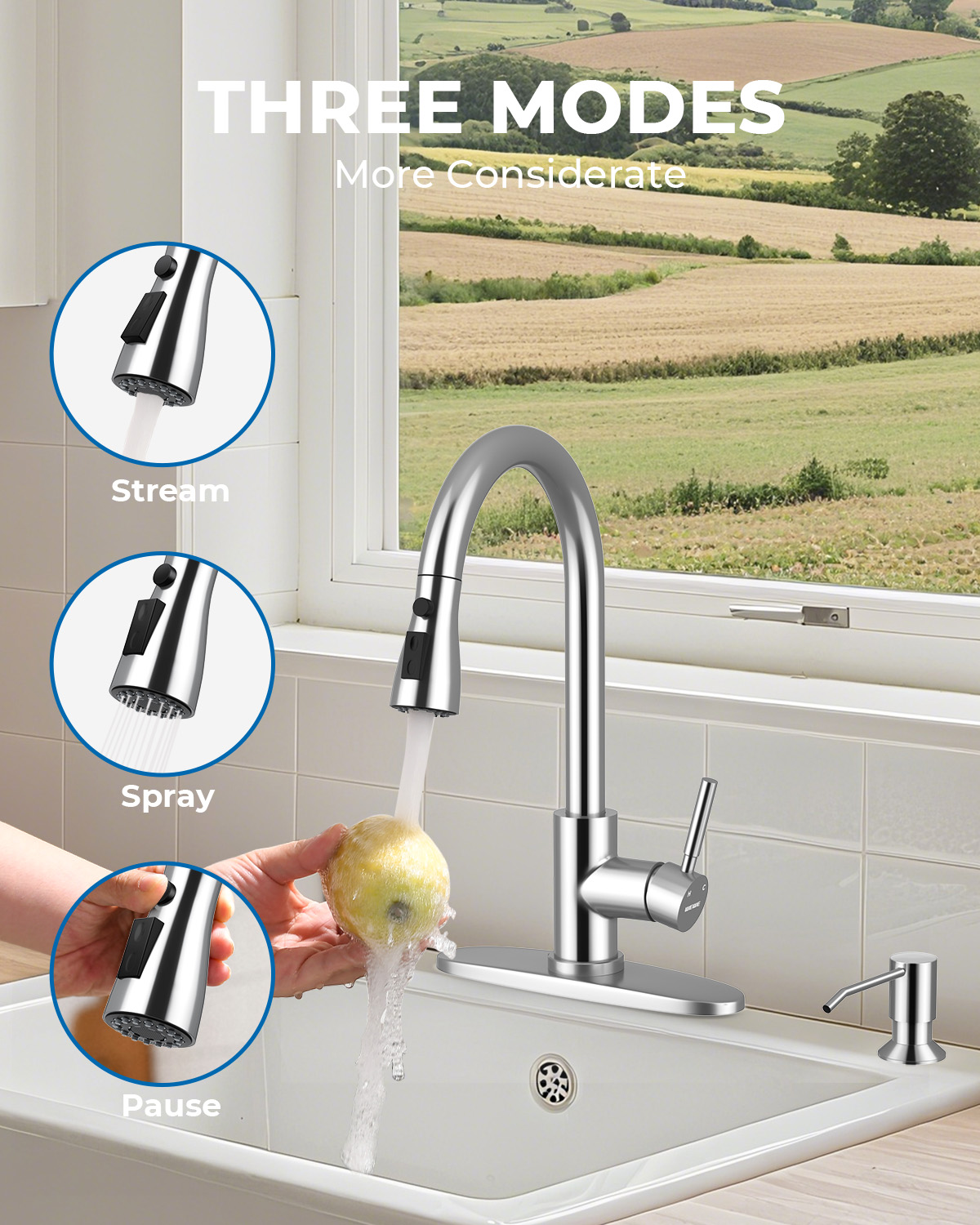 WEWE Kitchen Faucet with Soap Dispenser and Pull Down Sprayer, RV Single Handle Classic 3 Modes Stainless Steel Faucet for Kitchen Sink, RV, Polishede Chrome