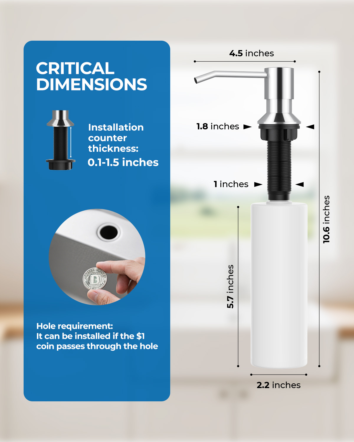 | Included Components | Kitchen faucet, Deck plate, Soap Dispenser, Mounting accessory |