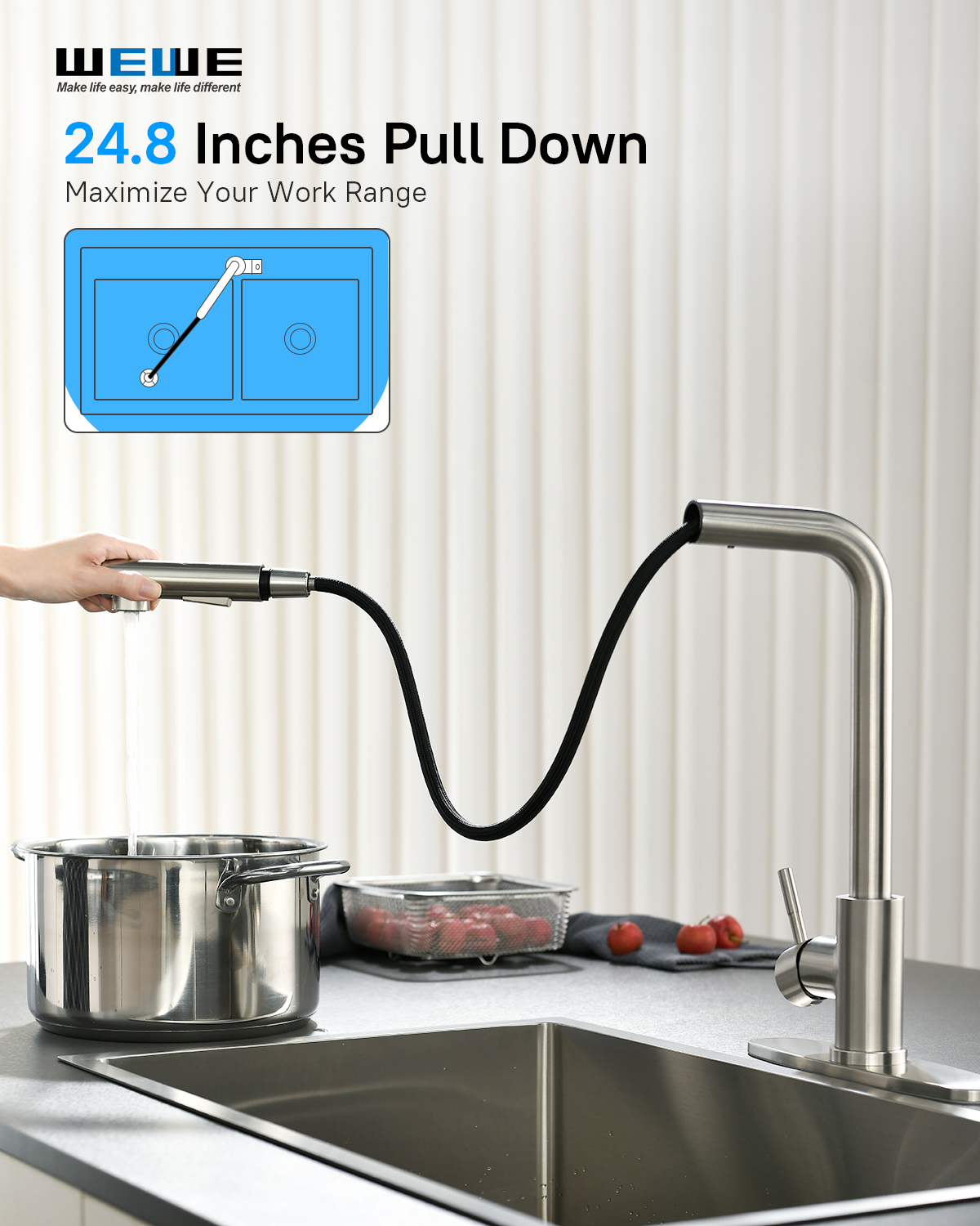 - [Extended Pull-Down Hose] The kitchen faucet with sprayer features a versatile 24.88-inch heavy-duty stainless steel hose for extended reach and easy sink cleaning. It offers effortless switching between a powerful Spray mode for cleaning and a steady Stream mode for filling.