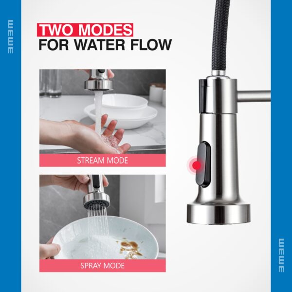 - Dual Functions: Different water mode functions of the kitchen faucets with pull down sprayer can fulfill different tasks requirement. The high quality nozzle of kitchen faucet offers aerated stream for cleaning and non-splash powerful spray for rinsing, just enjoy your kitchen with this commercial kitchen faucet.