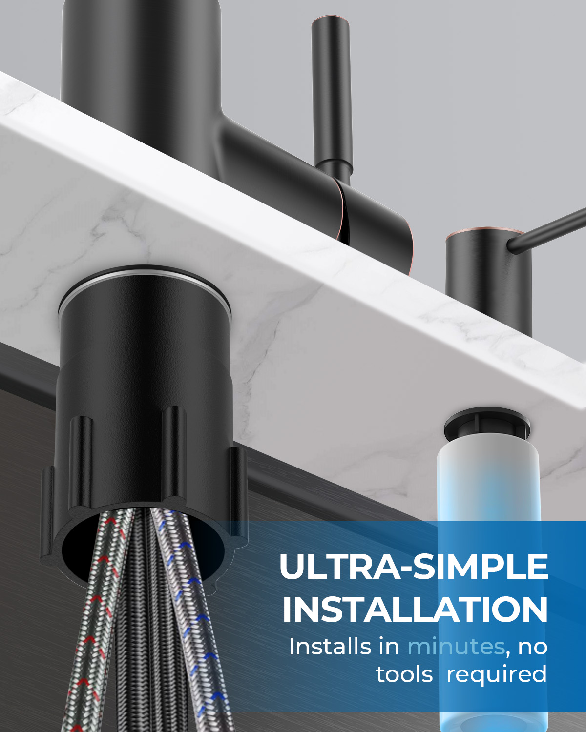 - 【Faster DIY with Extra-Long Hoses】 No plumber and no extensions needed. We provide longer supply lines to reach your shutoff valves easily: Cold 31.5″ (6.9″ longer than standard) and Hot 29.5″ (4.7″ longer than standard). Combined with pre-installed hoses and a TWIST-LOCK tool-free nut, you can secure a wobble-free mount in about 15 minutes.