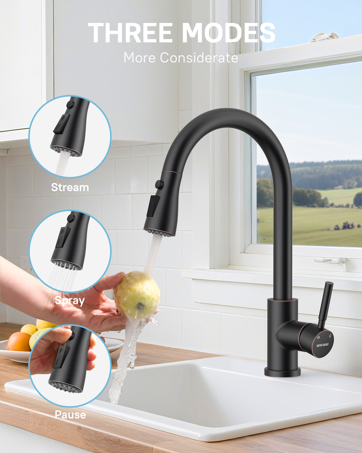 WEWE Kitchen Faucet with Pull Down Sprayer and Soap Dispenser, Stainless Steel Kitchen Sink Faucets, 3-Mode High Arc Single Handle Faucet for RV Farmhouse, Oil Rubbed Bronze