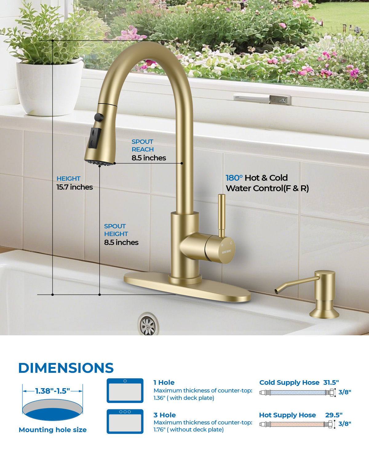 | Included Components | Kitchen faucet, Deck plate, Soap Dispenser, Mounting accessory |