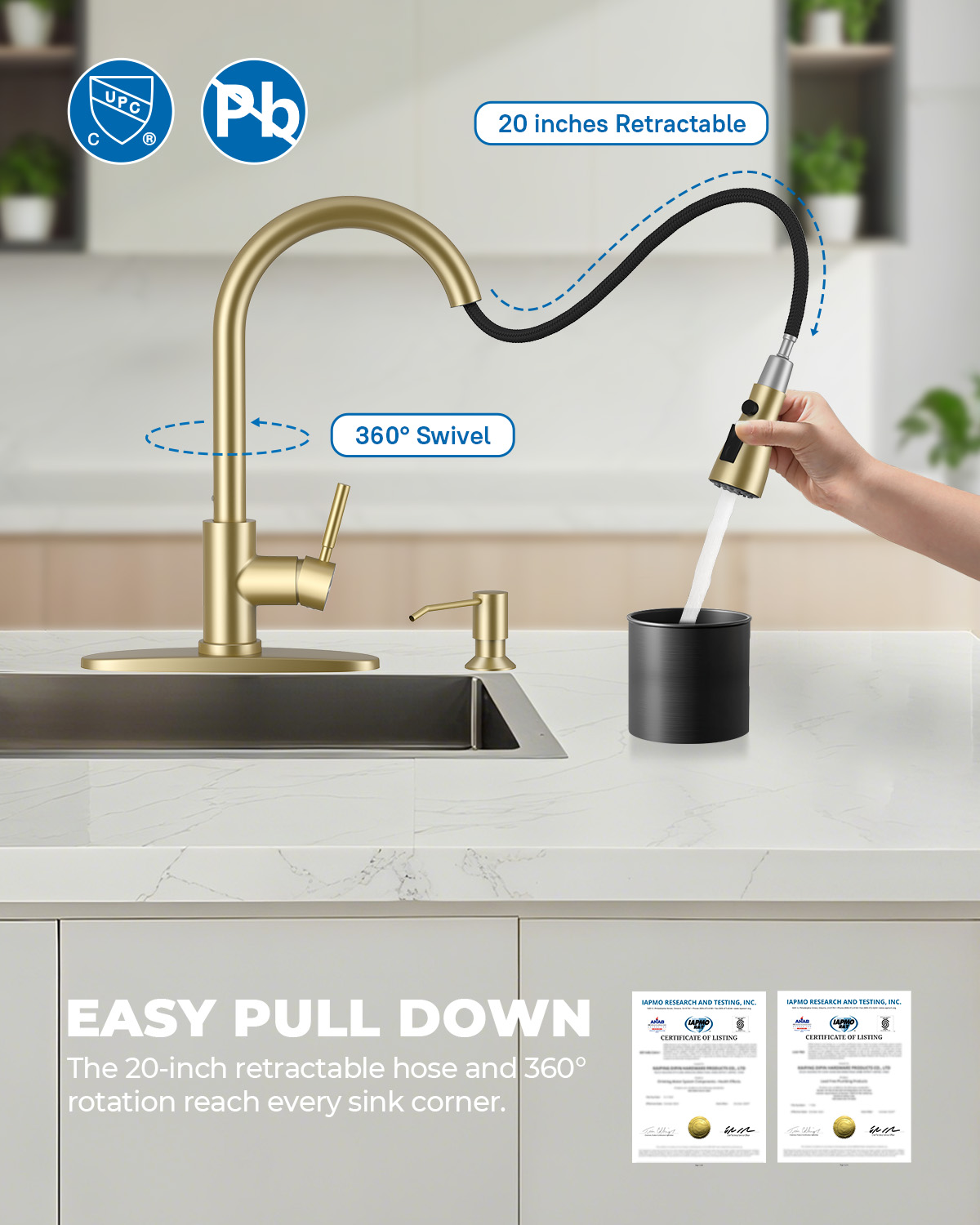 WEWE Kitchen Faucet with Soap Dispenser and Pull Down Sprayer, RV Single Handle Classic 3 Modes Stainless Steel Faucet for Kitchen Sink, RV, Gold