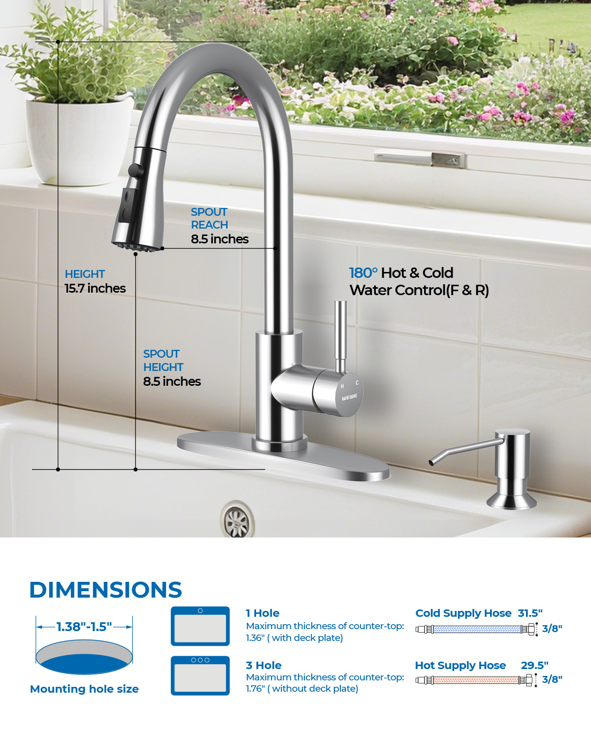 - [Premium WEWE Kitchen Faucet Set] Elevate your kitchen with our versatile faucet set, featuring a 15.7-inch faucet and a 10 oz soap dispenser—perfect for hand soap, dish soap, and beyond. Designed to seamlessly meet all your culinary needs.