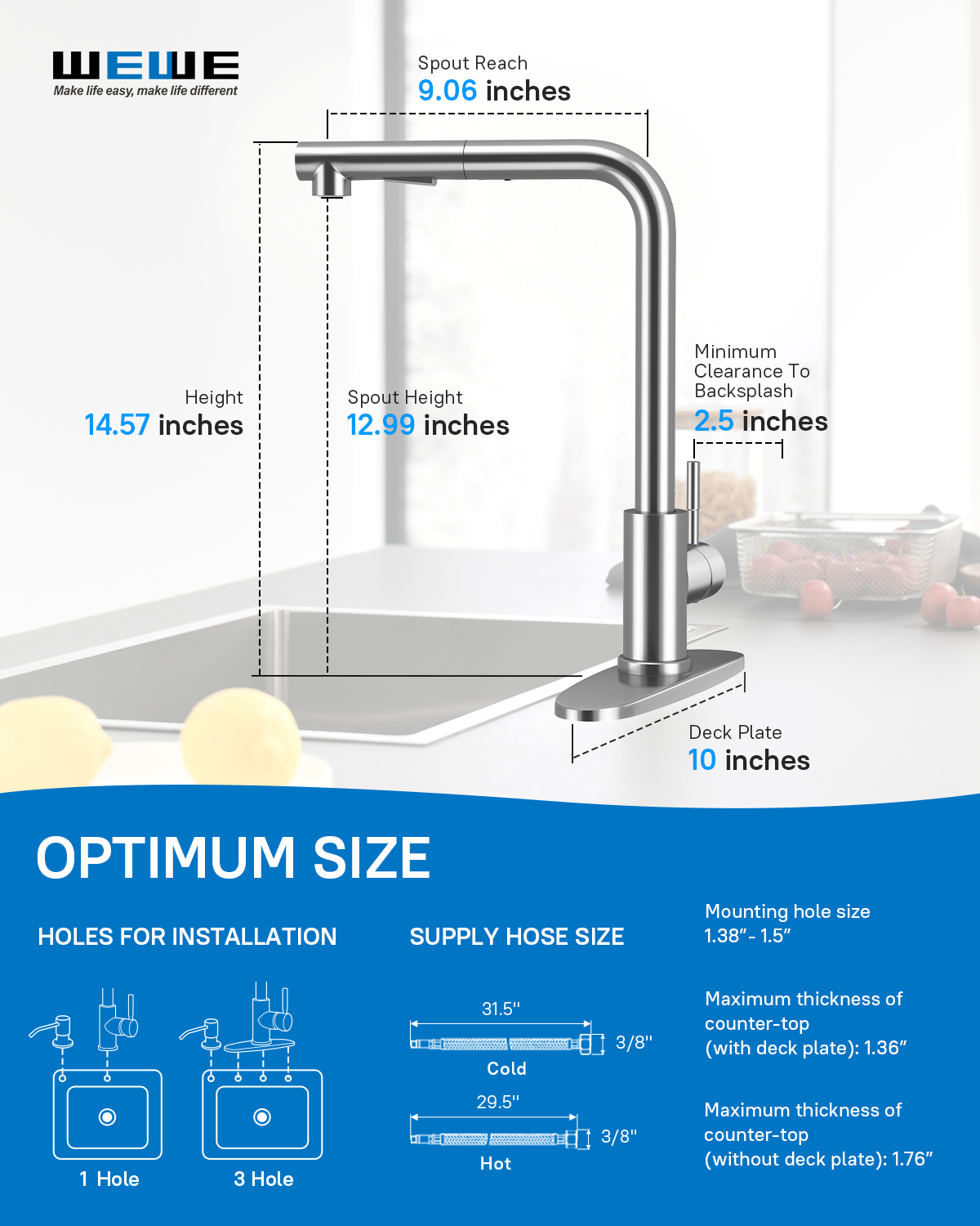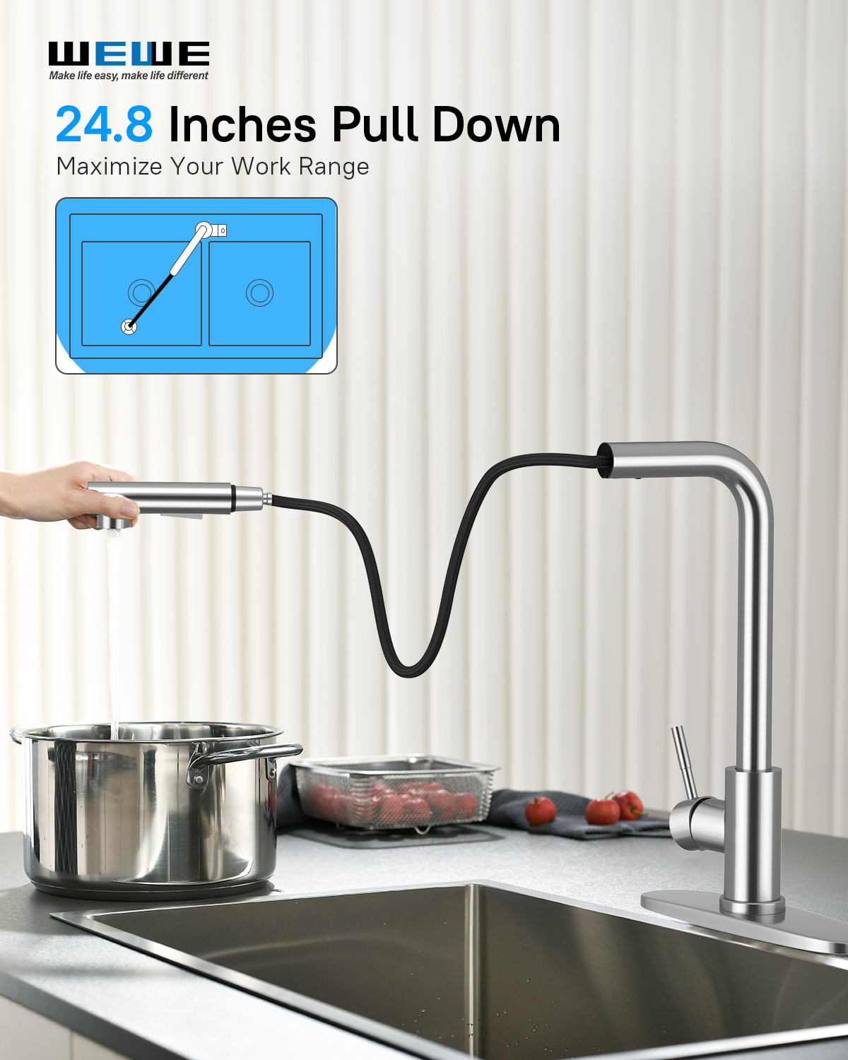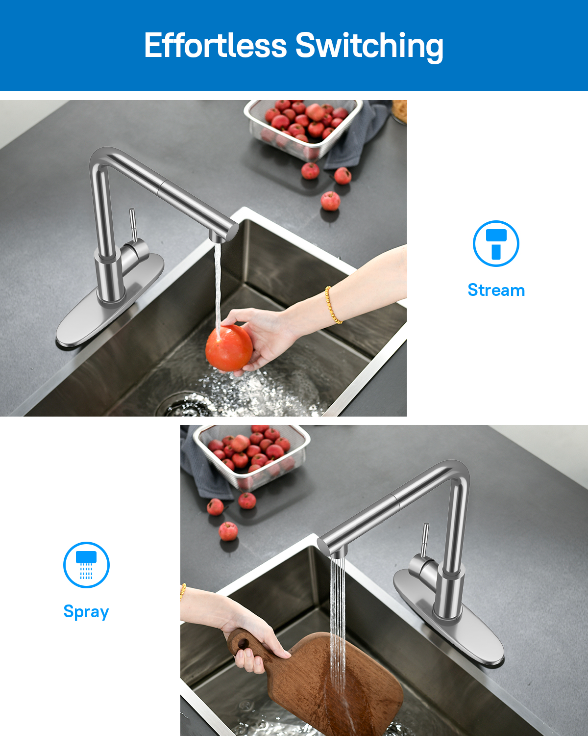 - [Extended Pull-Down Hose] The kitchen faucet with sprayer features a versatile 24.88-inch heavy-duty stainless steel hose for extended reach and easy sink cleaning. It offers effortless switching between a powerful Spray mode for cleaning and a steady Stream mode for filling.