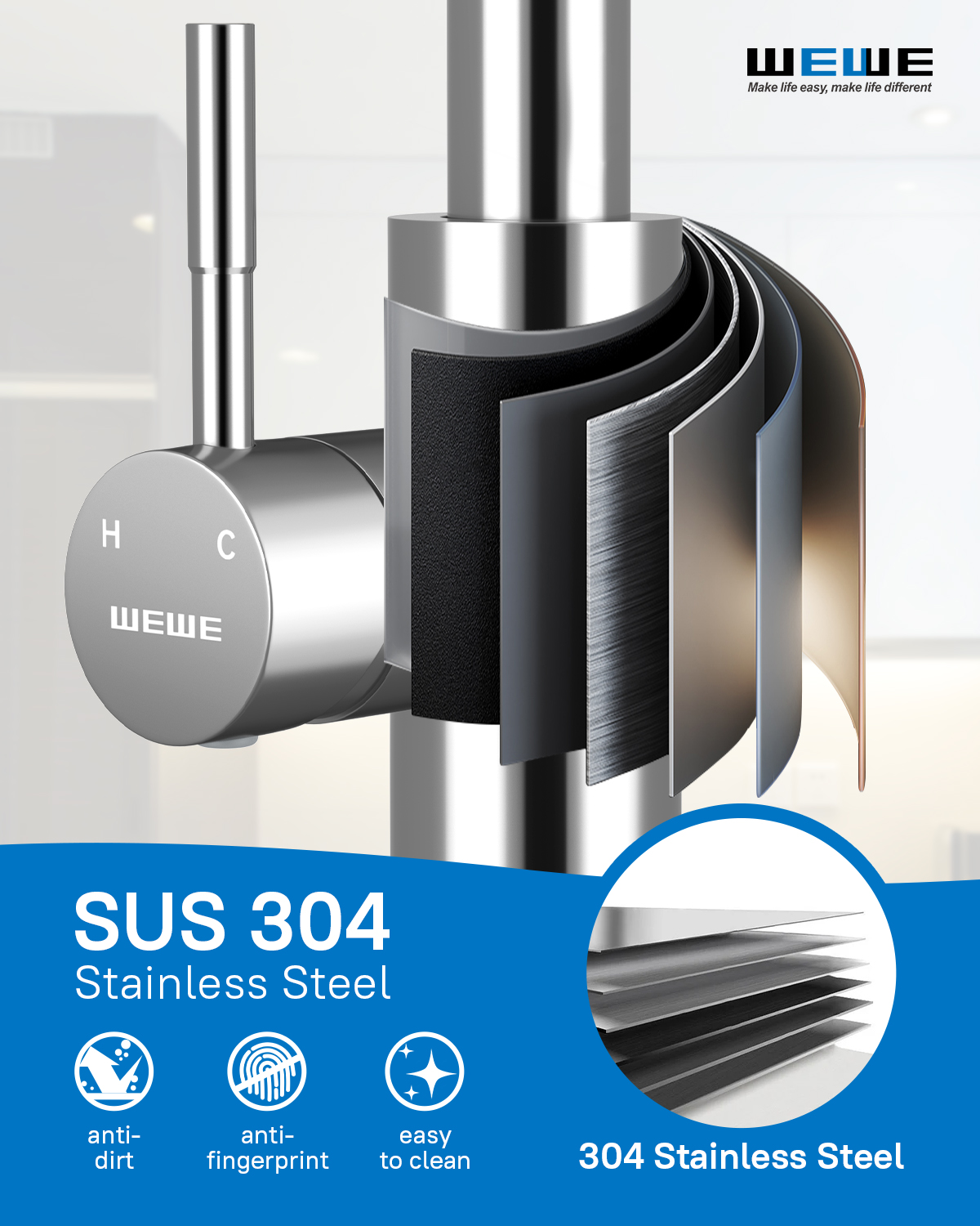 - [Durable PEX & 304 Braid] The kitchen faucet built with a high-quality PEX inner tube for durability, which is reinforced with a flexible 304 stainless steel braided exterior. This robust combination offers excellent resistance to corrosion, high water pressure, and wear for a reliable water supply.